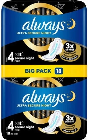 The Ultra Secure Night pads with wings from Always protect you from leaking your period for up to ten hours at night. The back is 60% larger than the Ultra Normal pad to give you extra security.
